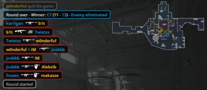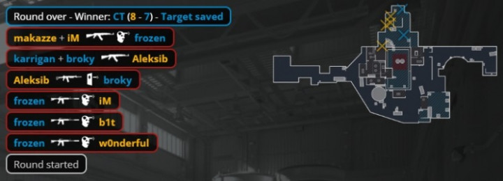 次回合makazze进玻璃房带走总监后,NAVI轻松进B下包拿到第10分。随后wonderful大狙对位打掉b1t,总监大仓双杀被换,寒王残局1v3黄房回防A点双杀,iM下包后被寒王强拆得手,FaZe拿到第8分。