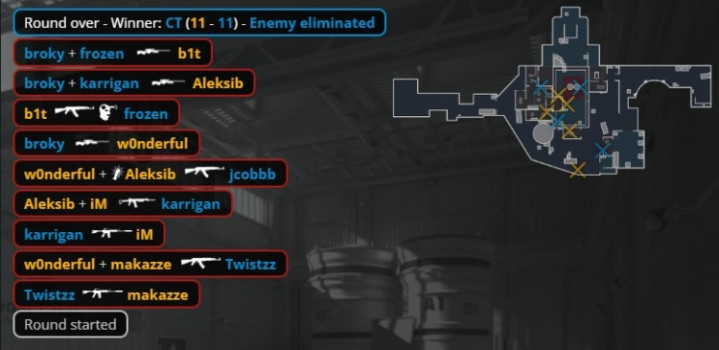 再到长枪局,b1t铁板换掉jcobbb,残局3v3,FaZe三人转A被wonderful+makazze双人三杀,NAVI随后再拿2分。第11回合长枪局,broky首杀iM后被makazze上K1打掉,总监独自进B点爆轰四杀为FaZe拿到第3分。